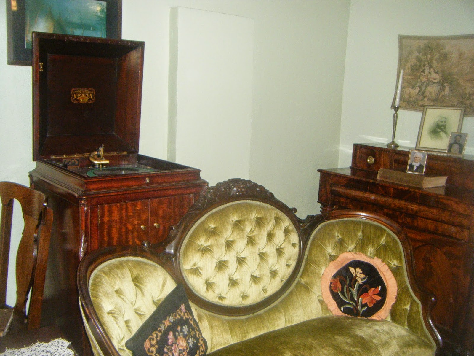 The living room is large enough for a separate seating area and a Victrola.